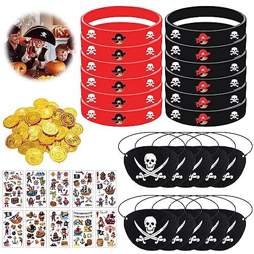 ❤ Merveilleux paquet de fête pirate : le paquet contient un total de 58 pièces d’articles de fête pirate, dont 12 * cache-œil pirate, Contient 12* bracelets en silicone pirate (2 couleurs), 10 feuilles d’autocollants de tatouage pirate temporaire, 24 pièces d’or en plastique.