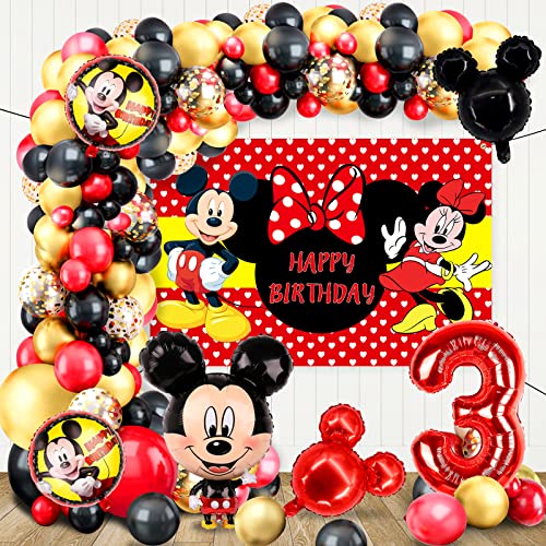 【Décorations d’anniversaire Mickey】 Les décorations de fête Mickey comprennent 1 x ballon en aluminium numéro « 3 »,1 x fond Mickey, 1 x ballon en aluminium Mickey, 1 x ballon rouge Minnie, 1 x ballon noir Mickey, 2 x ballons ronds en aluminium, 65 x ballons en latex, 3 x ruban, 1 x chaîne de ballon, 1 x colle à points.