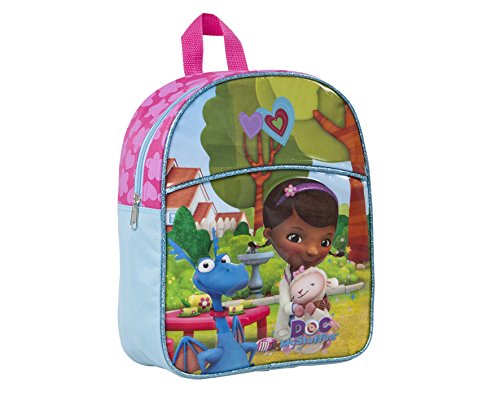 Ce sac à dos sous licence officielle de Docteur La peluche mesure environ 33 cm de longueur et 24 cm de largeur. La fermeture éclair est en bleu clair et au dos du sac les bretelles sont roses. Le devant du sac est en plastique imprimé du docteur la peluche câlinant Lammie au côté de Touf. Un liseré en bleu pailleté vient contourner le sac. Votre enfant sera enchanté de porter ce sac à dos à leffigie de son dessin annimé préféré.avant en PVC