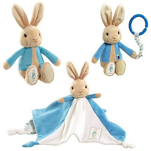Ce produit dérivé tiré de l’univers du dessin animé Pierre Lapin a pour nom officiel : Beatrix Potter Ma Première couverture Confort Pierre Lapin Hochet à jouet pour poussette Coffret cadeau.