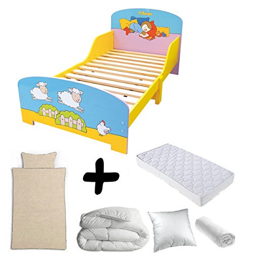 Couleur : Jaune et BleuPack LUXE : Lit + Matelas + Literie 5 pièces. 8en1 : lit+sommier+matelas & parure+drap & couette+oreiller+taie. Oreiller + couette en fibres très légères et poreuses : Ce qui donne un moelleux exceptionnel et une bonne aération. Pack lit T’choupi premium de haute qualité et tout confort ! Attention DIM du lit : 140x70cm (taille enfant 7 ans maximum ). Licence Officielle. Couleur : Jaune et Bleu