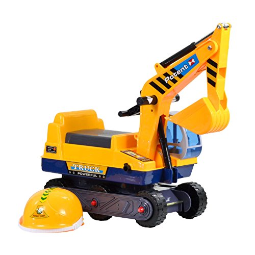 Un tractopelle à chevaucher entièrement fonctionnel avec bras amovible et extensible, pelle et chargeur, cabine rotative et un casque avec mentonnière pour s’amuser en toute sécurité.