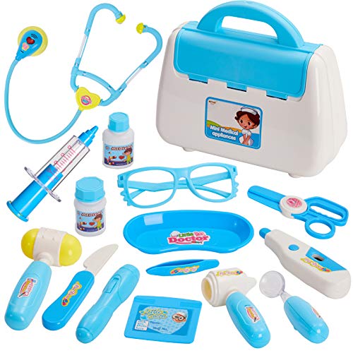 【16 Pièces Valisette Docteur pour Enfants】 – Y compris stéthoscope, otoscope, lampe de poche, seringue, marteau réflexe, ciseaux, scalpel, plateau, lunettes, valise X 1, flacon de médicament X 2, etc. Recommandé pour les enfants de plus de 3 ans.