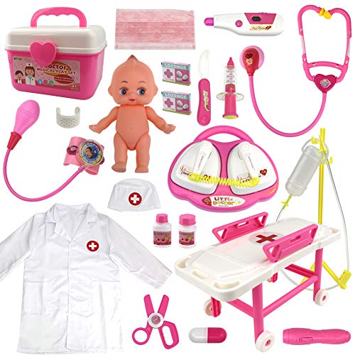 Jouet Docteur pour Enfant: 1 stéthoscope, 1 Thermomètre, 1 lampe de poche, 1 bouteille de médicament, 1 boîte à médicaments, 1 Pills, 1 ciseaux, 1 seringue, 1 scalpel, 1 tensiomètre manuel , 1 Bande hémostatique, 1 Défibrillateur ECG, 1 civière jouet, 1 bouteille d’infusion et support suspendu, 1 masques médicaux, 1 poupée, 1 malette, 1 costume de médecin, 1 chapeau