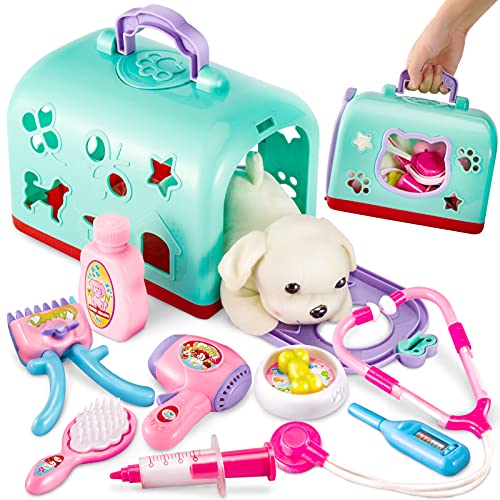 [Kit Vétérinaire] – Comprenant cage (27 * 17 * 18 CM), peluche chien (21 * 9 * 8 CM), stéthoscope, seringue, sèche-cheveux, brosse, shampoing, tondeuse, gamelle pour chien, etc. Apportez aux enfants une expérience de jeu réelle et intéressante.