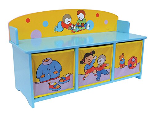 Couleur : Bleu & JauneDescriptif produit: TCHOUPI banc en bois, Structure MDF Laqué, épaisseur 12mm, avec 3 bacs de rangement souples (polyester, carton). Revêtement laque polyuréthane. Boite quadricolore.