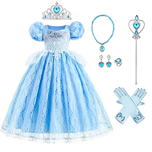 Jolie robe de princesse Cendrillon Sofia pour fille – Costume de conte de fées – Pour anniversaire, concours de beauté, fête, séance photo avec couronne de princesse, baguette magique, boucles d’oreilles, collier, bague, gants – Design super élégant et magnifique, votre petite amie se sentira comme une vraie princesse dans cette robe de princesse Cendrillon