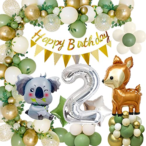 【Décoration Anniversaire Garcon Fille】l’ensemble de décoration anniversaire 2 an jungle,2 an comprend une bannière de joyeux anniversaire, un ballon numéroté de 2 an, un ballon en latex de 12 pouces (couleur avocat * 18, beige * 10, métal doré * 5, points transparents * 5), 5 pouces ( Couleur avocat * 10, beige * 8, métal doré * 5), ballon cerf, ballon koala, pentagramme de 18 pouces (argent * 1, vert clair * 1), ruban, adhésif pour ballon,Tous réutilisables!