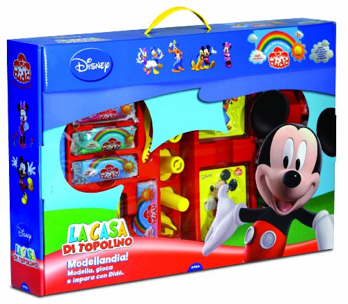 L’intérieur troverai 500 g de pâte à jouer didò, 3 formes avec le piinçon et un timbrino, 6 moules des personnages Disney, pâtisserie, couteau et un double Stage où dangereuses histoires