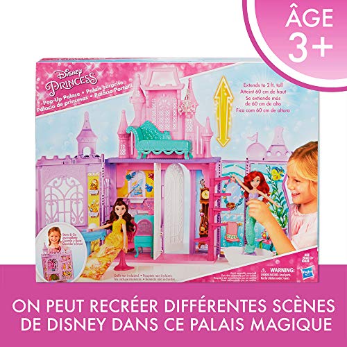 Château Disney Princess avec 5 pièces différentes : Il suffit d’ouvrir les portes pour découvrir les 5 pièces différentes : la cuisine d’Aurore, le vestibule de Cendrillon, la salle de bain d’Ariel, la salle à manger de Belle et un salon luxueux.