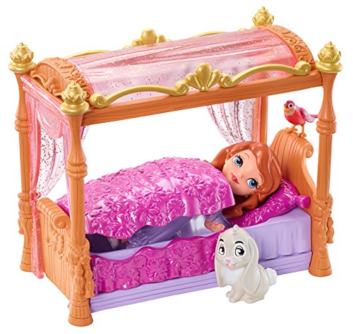Based on the hit new animated series from Disney Junior, Sofia the First. After Sofiaâ€TMs mother marries the King of Enchancia, Sofia must adapt to an extraordinary life of royalty and learn how to be a princess – inside and out. To learn how to act like a proper princess, she also overcomes her new step-sisterâ€TMs jealousy and the bumbling Royal Sorcererâ€TMs evil scheme to take over the kingdom. All along the way, she gets the guidance and support of friends, both old and new. Girls will love celebrating all the magic from Sofia the First! To expand the fun, works with the Magical Talking Castle, (sold separately). Girls can recreate their favorite moments from the hit series! Every princess needs her beauty sleep and this is the perfect spot for the loveable Sofia the First to lay her princess head. Dressed in a sweet nightgown and wearing her signature purple amulet, Sofia is ready to end the day in royal style. Her canopy bed is majestic with tall wooden posts, gilded accents on top and a translucent, glittery pink canopy with charming molded draping. Girls can open the pink bed, with its matching pillow, to tuck in a 3-inch Sofia small doll for a night of sweet dreams. Sofia can snuggle in her Royal bed with all her beloved animal friends! Sofia can snuggle with her beloved rag doll and two of her adorable animal friends: Clover the Rabbit or Robin the Robin. Her royal bedroom also includes a wooden chest for her animal friends to sleep and play in. To expand the fun, both the Sofia doll and Clover the Rabbit figure also unlock phrases in Sofia the First’s Magical Talking Castle, sold separately. Girls simply place the dolls on the magic base in the castle to activate. Sofia’s royal bedroom set includes the canopy bed, trunk, Sofia doll, Clover the Rabbit and Robin the Robin figures and small rag doll accessory. Celebrate all the magic of Disneyâ€TMs Sofia the First! For a magical touch, the dolls also unlock phrases in Sofia the First’s Magical TDescriptif produit: Sofia dans sa chambre de princesse. Lit à baldaquin, coffre doré, sa poupée, Clovis et un oiseau.