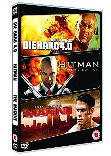 Please note this is a region 2 DVD and will require a region 2 or region free DVD player in order to play.Triple bill of action thrillers. Bruce Willis reprises his role of John McClane – the everyday NY cop with a knack for being in the wrong place at the wrong time – in ‘Die Hard 4.0’ (2007). Set in Washington DC, this fourth instalment of the franchise finds McClane being asked to bring in computer hacker Matt Farrell (Justin Long) for routine questioning. In transit, events overtake them as they witness a full-scale cyber attack on the country’s infrastructure led by mystery attacker Thomas Gabriel (Timothy Olyphant), who plans to systematically shut down or destroy the nation’s major networks over three days. With time running out, McClane and his hacker friend have to stop the mastermind before it is too late. ‘Hitman’ (2007) is a fast-paced thriller based on the computer game of the same name. A professional assassin known only as Agent 47 (Olyphant), hired by a group known only as ‘The Agency’, is ensnared in a political conspiracy which finds him on the run from both Interpol and the Russian FSB (successor to the KGB). The hunter becomes the hunted as he is chased across Eastern Europe while, at the same time, he tries to find out who set him up and why they’re trying to take him out. John Cena stars in ‘The Marine’ (2006) as John Triton, an injured US Marine who returns home from duty only to have his wife kidnapped by a ruthless criminal. Robert Patrick co-stars as the villainous Rome, who is more than willing to kill if it means staying one step ahead of the law. With nothing left to lose and enough training to take down a small army, the hard-fighting Triton sets out to rescue his wife, and ensure that the psychotic Rome receives a painful taste of justice.