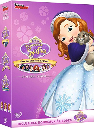 Le titre de ce DVD tiré de l’univers du dessin animé Princesse Sofia est : Princesse Sofia avec des invités d’honneur-Coffret 3 DVD.