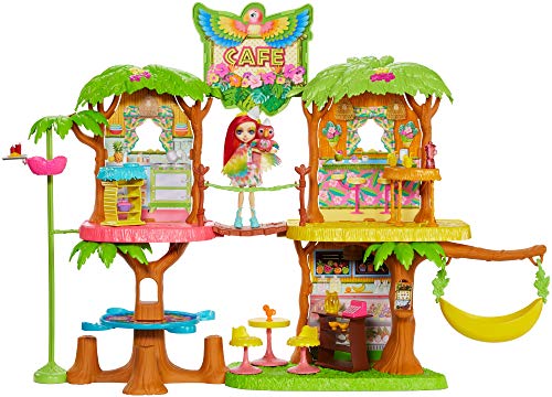 Cet article tiré de l’univers du dessin animé Mini-Loup a pour nom officiel : Enchantimals Coffret Maison Café Jungle Enchantée, Mini-poupée Peeki Perroquet, Figurine Animale Sheeny, balançoire et accessoires, jouet enfant, GNC57.