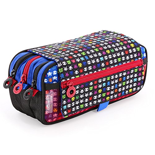 Ce produit dérivé tiré de l’univers du dessin animé Les Triplés a pour nom officiel : Fresh Fashion 58301 – Trousse / Fourre Tout Triple du Spacieuses Sections Intérieures avec Fermeture à Glissière Individuel, Cas Multi Purpose pour Fournitures Scolaires, Couleur Garçon Space Invaders, Dimensions 22 x 11 x 9 cm.