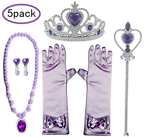 Ce produit dérivé tiré de l’univers du dessin animé Princesse Sofia a pour nom officiel : GCFIYPP Princesse Habiller Accessoires 5 Pièces Cadeau Violet Set pour Sofia Couronne Sceptre Baguette Collier Boucles d’oreilles Gants.