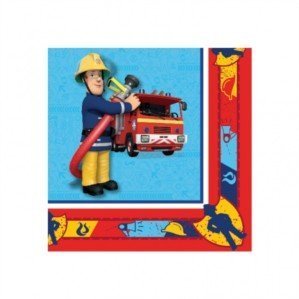 Ces 20 serviettes en papier sont sous licence officielle Sam le pompier.   Dépliées, elles mesurent 33 x 33 cm. Le visuel présente Sam, lance à eau à la main et son camion de pompier à l’arrière. Le fond est bleu clair et le contour de la serviette est rouge.   Disposez vos serviettes pour le goûter d’anniversaire de votre petit garçon sur le thème de son héros favoris Sam le pompier.Fireman Sam serviettes – Pack de 20