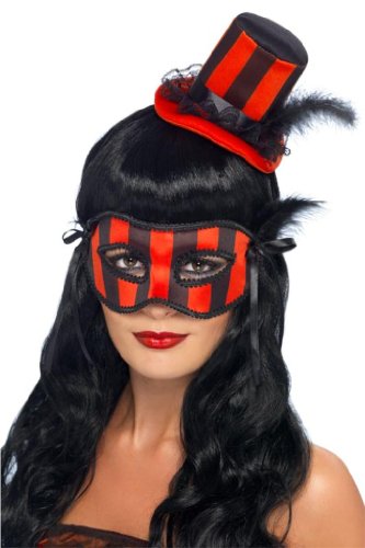 Ce kit contient un loup et un mini chapeau. Le loup est rayé noir et rouge avec une plume noire somptueuse. Il est orné, sur le pourtour, dun liseré argenté, sa forme est très originale. Deux rubans noirs satinés permettent de lattacher à votre tête. Le mini chapeau assorti est cousu sur un serre tête noir en velours. Sur le chapeau deux plumes noires et de la dentelle noire sont cousues . Cet accessoire sera idéal si vous souhaitez allier élégance et mystère lors dun bal masqué ou dune soirée déguisée.Age minimum : 3 ans