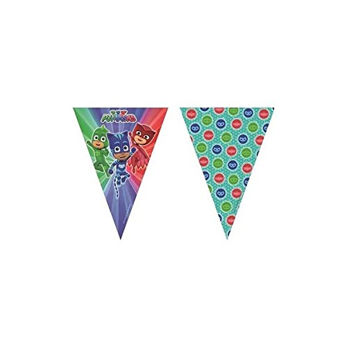 Ce produit tiré de l’univers du dessin animé Pyjamasques a pour nom officiel : Generique – Guirlande Fanions Pyjamasques 2,3 m x 25 cm.