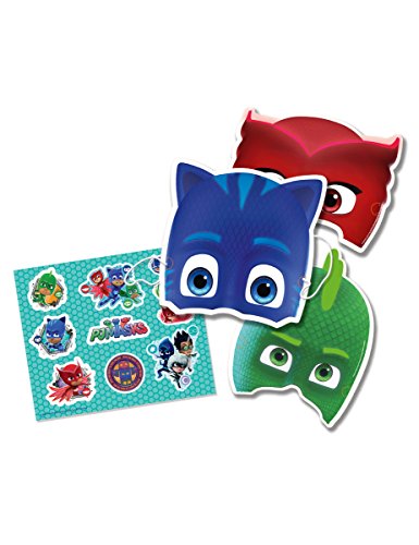 Ce lot pour enfants est sous licence officielle Pyjamasques .  Il comprend :  – 6 masques en carton plat – 6 planches dautocollants Les masques représentent les personnages Bibou, Yoyo et Gluglu, les célèbres Pyjamasques ! Vous pourrez découper les yeux afin de garantir une bonne visibilité aux enfants. Ils se maintiennent en passant un élastique derrière la tête.  Les planches de stickers contient 10 autocollants chacune. Décorez vos cartes dinvitations, vos carnets, ou même vos masques avec ces autocollants.  Ce lot sera parfait pour créer une animation amusante pour lanniversaire de votre enfant !6 Masques plats 6 Planches de 10 stickers