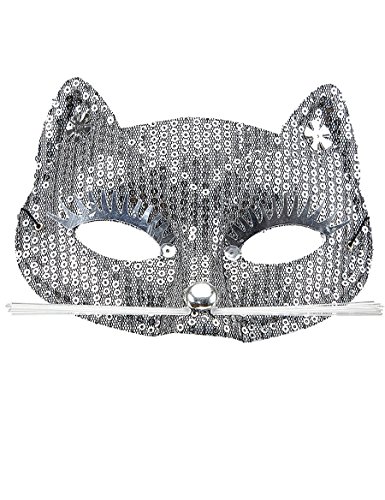 Ce loup de chat est pour adulte. Il est blanc et est recouvert dun noir très fin. Des rangées de mini sequins argentés sont cousues à lavant du masque pour lui donner un effet brillant.Les yeux et les oreilles sont soulignés par des décors argentés.Des moustaches en plastique transparent sont fixées au niveau du nez.Ce loup se maintient au visage à laide dun élastique fin. Ce masque sera parfait pour compléter un costume de chat le jour du Carnaval.   Copyright Widmann SRLLoup