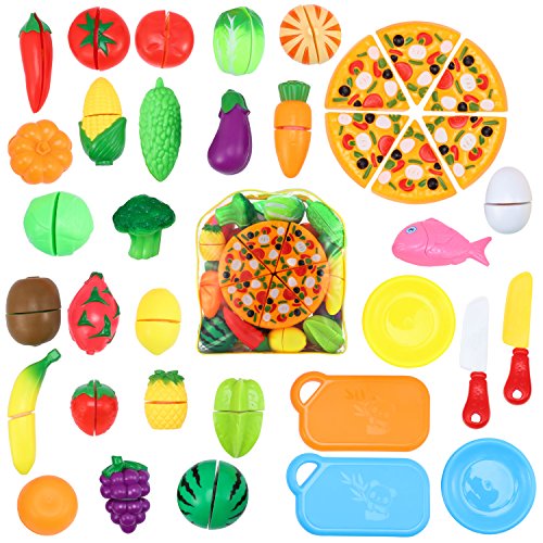 37 PCS comprennent: banane, pomme, raisin, pastèque, citrouille, poivron vert, aubergine, carotte, chou, tomate, poisson, orange, ananas, maïs, fraise, citron, pitaya, gourde amère, carambole, oignon, brocoli, chili kiwi, œuf, tourte à pizza, vaisselle, couteaux, planche à découper (tous en ABS, sans danger pour les enfants)Matériau de haute qualité: en ABS non toxique et écologique, durable, lavable et résistant à l’écrasement. Il a été testé pour être sans danger pour les enfants