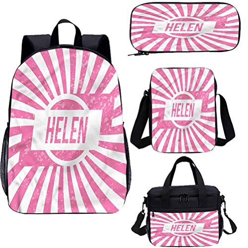 Ce produit dérivé tiré de l’univers du dessin animé La petite école d’Hélène a pour nom officiel : Helen Ensemble de sac à dos avec sac à déjeuner et trousse à crayons, lettres vieillies, 4 en 1.