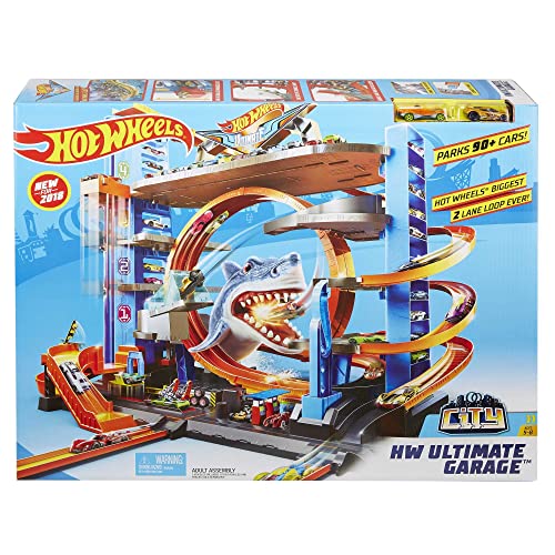 CET ÉNORME GARAGE peut accueillir plus de 90 voitures Hot Wheels (vendues séparément). L’énorme boucle à double voie avec attaque de requin surprise rend la course encore plus palpitante