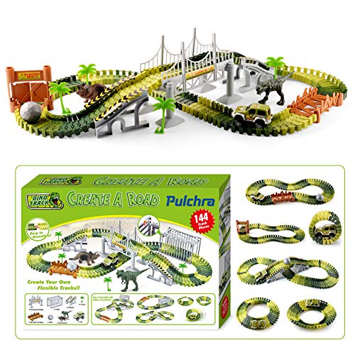 Jeux de dinosaure Pulchra Set Set de course de voiture 144Pcs, Type combiné et détachable DIY Road Pistes flexibles Modèle créatif Track Play Set Racing Game pour enfants