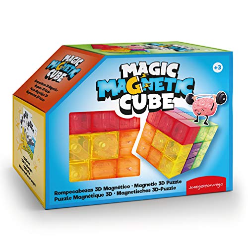 JUEGACONMIGO Magic Magnetic Cube. Blocs de construction magnétiques, un jeu de concentration et d’acuité mentale. 7 pièces magnétiques 3D transparentes et une carte avec 108 défis à construire.