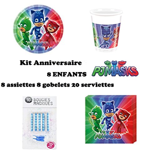 Cet article tiré de l’univers du dessin animé Pyjamasques a pour nom officiel : Kit PJ MASKS pyjamasques 36 pièces Anniversaire Fête 8 enfants (8 gobelets, 8 assiettes et 20 serviettes) 10 bougies offertes.