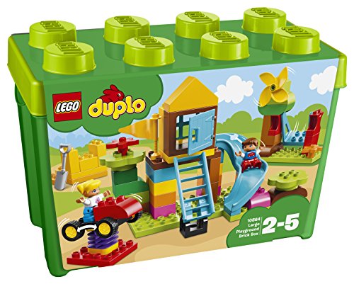 Stimulez l’imagination de votre enfant avec La grande bo?te de la cour de r?cr?ation LEGO? DUPLO?, con?ue pour cr?er une aire de jeux riche en aventures et en fonctions amusantes. Cet ensemble aux couleurs vives comprend un moulin qui tourne, une balan?oire qui fonctionne, 2 toboggans, un tour en voiture rebondissante sur ressort et 2 figurines DUPLO. Les jeunes enfants peuvent ainsi s’amuser ? construire et ? reconstruire une cour de r?cr?ation diff?rente ? chaque fois. L’emballage sert aussi de bo?te de rangement tr?s pratique. Inclut 2 figurines d’enfant LEGO? DUPLO?.Comprend une cabane dans un arbre avec un toboggan, une zone de balan?oires avec un moulin et un tour en voiture rebondissante.Livr? avec 71 pi?ces LEGO? DUPLO? color?es, dont un moulin ? vent qui tourne, une balan?oire, une ?chelle ? charni?re, 2 ?l?ments de toboggan, un ressort, une base avec roues, une porte, une fen?tre, une pelle, un drapeau et des fleurs.Encouragez la cr?ativit? de votre enfant avec cet ensemble de grosses briques polyvalent.Aidez votre enfant ? construire et ? jouer avec sa propre cour de r?cr?ation LEGO? DUPLO?.Il exercera ses comp?tences de jeu de r?le et inventera des histoires avec les figurines LEGO? DUPLO?.Rangez toutes les pi?ces LEGO? DUPLO? dans la bo?te de rangement tr?s pratique.Les produits LEGO? DUPLO? sont amusants et sp?cialement con?us pour les petites mains.Adapt? aux enfants ?g?s de 2 ? 5 ans.La cabane dans l’arbre avec le toboggan mesure plus de 20 cm de haut, 30 cm de large et 13 cm de profondeur.La balan?oire avec le moulin mesure plus de 17 cm de haut, 14 cm de large et 6 cm de profondeur.Construisez une cabane dans un arbre avec un toboggan, une zone de balançoires avec un moulin et un tour en voiture rebondissante