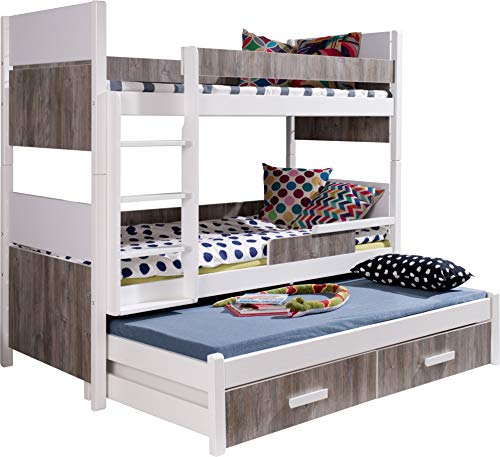 Ce produit tiré de l’univers du dessin animé Les Triplés a pour nom officiel : Lit superposé triple pour enfants – AUGUSTO – En bois de pin massif naturel avec matelas et tiroirs – Blanc/Chêne gris.