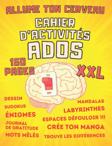 Le titre de ce livre tiré de l’univers du dessin animé SamSam est : Allume Ton Cerveau Cahier d’activités ADOS XXL: livre de jeux pour adolescents, idéal pour quitter les écrans : crée ton manga, énigmes, devinettes, blagues, espaces défouloir….