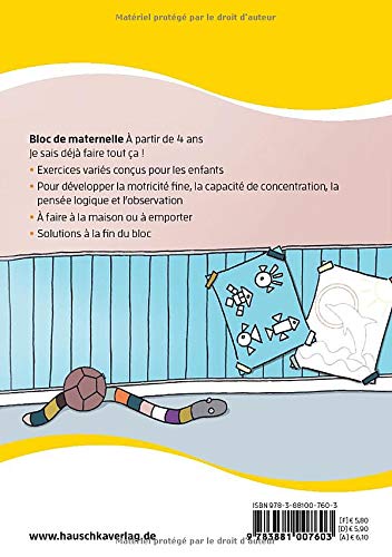 Le titre de ce livre tiré de l’univers du dessin animé Mickey et ses amis est : Bloc de maternelle – Je sais déjà faire tout ça ! À partir de 4 ans, A5-Bloc.