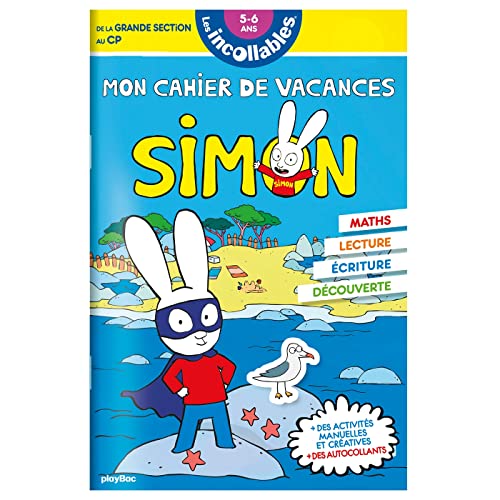 Le titre de ce livre tiré de l’univers du dessin animé Simon, Super lapin est : Cahier de vacances Simon – De la GS au CP – 5-6 ans.