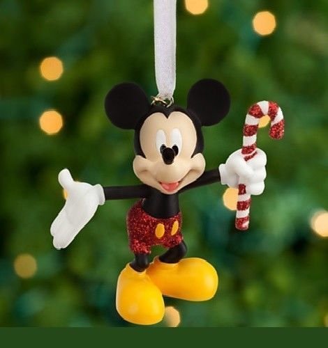 Mickey fait joyeux pour les vacances avec cette figurine entièrement sculpté ornement givré en scintillant rayures rouges pantalon et Candy Cane.Officiellement sous licence Disney marchandise