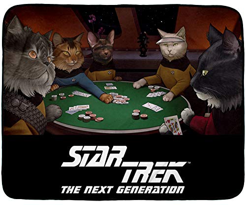 Design unique Star Trek TNG – Avec Star Trek, il y a une quantité incroyable de produits, nous avons donc voulu créer une couverture cool avec un superbe design. Nous espérons que les Trekkies sont approuvés. La couverture en peluche Minky dispose d’un design de 5 personnages de Star Trek Cat assis autour d’une table de jeu de cartes. Si vous regardez de près et que vous êtes un véritable fan de TNG, vous pourrez reconnaître quel personnage Star Trek conçu pour les chats