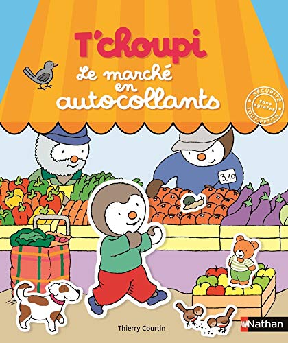 Le titre de ce livre tiré de l’univers du dessin animé Tchoupi est : Le marché en autocollants – Dès 2 ans.