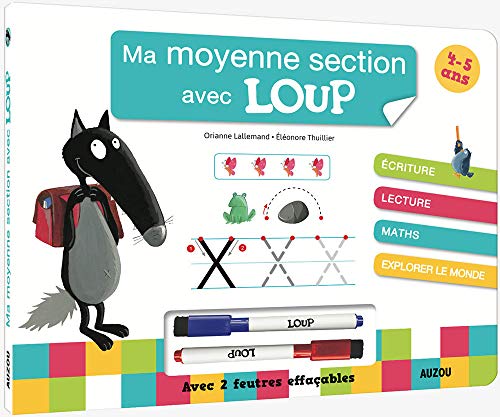 Le titre de ce livre tiré de l’univers du dessin animé Tchoupi est : Ma moyenne section avec Loup : Avec deux feutres effaçables.