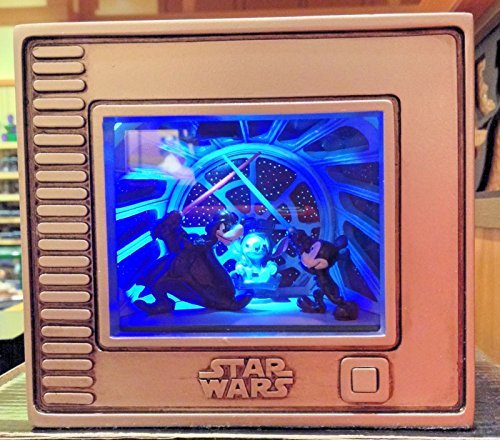 parcs Disney authentique coque originale de Matte Box cadre aluminium argenté décoré avec du noir et du verre. Commutateur sur le thème de Star Wars en cadre lumières LED s’allume. Peut être placé sur une étagère ou accroché au mur. Peinte à la main resin4 « H x 4 1/5,1 cm W x 3 1/5,1 cm d nécessite 3 piles AAA, non fournies. Importé. Certificat de authenticitypart de la galerie de la collecte de lumière par olszewski.