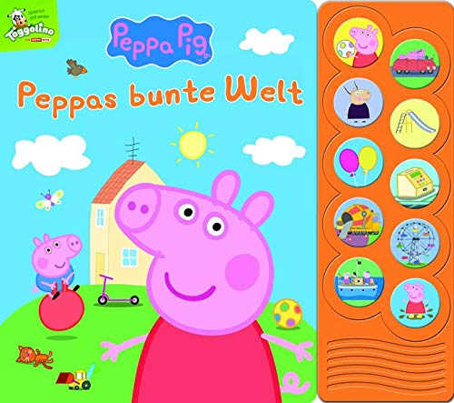 Le titre de ce livre tiré de l’univers du dessin animé Peppa Pig est : Peppa Pig – Peppas bunte Welt – Interaktives Pappbilderbuch mit 10 lustigen Geräuschen.