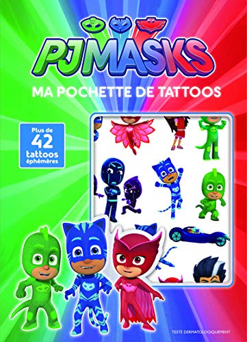 Le titre de ce livre tiré de l’univers du dessin animé Pyjamasques est : Pjmasks – Ma pochette de Tattoos.