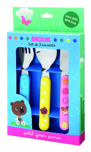 Set de 3 couvert – Mouk Mouk est un véritable globe-trotter, il arpente le monde à vélo. Avec lui, Marc Boutavant nous fait découvrir des paysages incroyables et des coutumes peu connues. Une dimension idéale pour apprendre à se servir de ses couverts comme les grands ! En inox. Dimensions de la boîte : 11 x 19 x 2 cm.