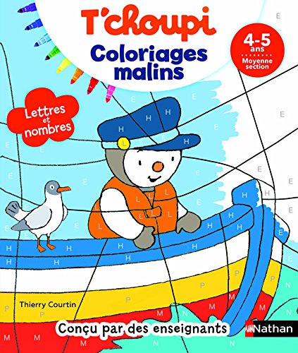 Le titre de ce livre tiré de l’univers du dessin animé Tchoupi est : T’choupi Coloriages Malins – Lettres et nombres.