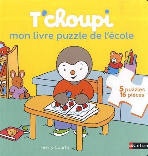 Le titre de ce livre tiré de l’univers du dessin animé Tchoupi est : T’choupi, mon livre Puzzle de l’école – Dès 2 ans.