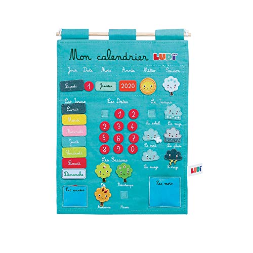 LUDI – Calendrier bleu pour enfant dès 3 ans. Panneau en tissu brodé 53 x 38 cm. Accroche murale avec une corde et une lamelle en bois. 45 étiquettes amovibles – réf. 2096