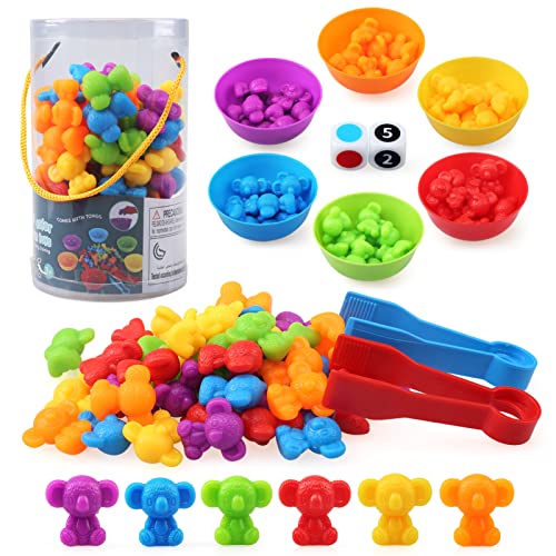 【Compter les jouets Koalas】 Compter les koalas arc-en-ciel – Les jouets de tri et de comptage Montessori comprennent 48 koalas, 6 bols, 2 clips, 2 dé et 1 gobelet de rangement en plastique. 6 types de couleurs du koala et du bol : rouge, orange, jaune, vert, bleu violet.
