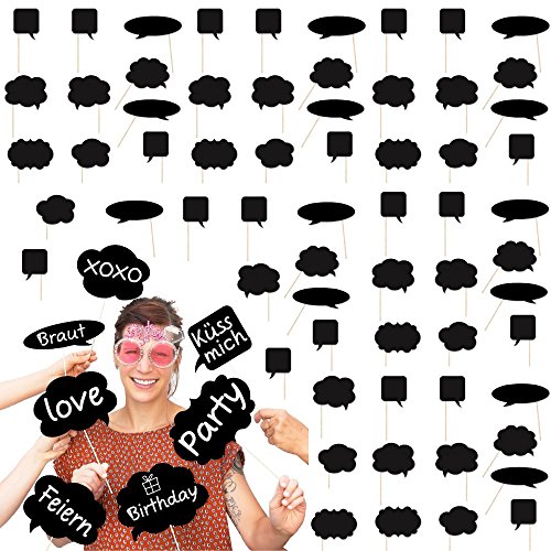 Ce kit accessoires photo/Photo Booth est composée à 60 sprechblasen avec bois et 60 stickers pour faciliter la fixation. Avec craie Edding ou les accessoires photo à écrire. Convient parfaitement pour JGA/enterrement de vie de jeune fille, anniversaires, fêtes et autres fêtes. Photos besoin mais aussi de mariage avec ces accessoires de photo sont garanties.Contenu de la livraison : 60 sprechblasen avec baguettes en bois et 60 autocollants pour fixation