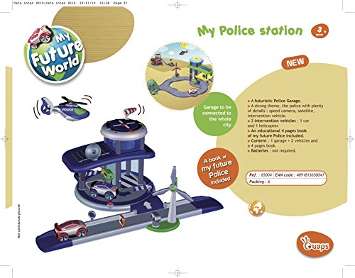 Descriptif produit: Un garage ultra-moderne sur le thème de la Police. Une éolienne, un hélicoptère, une voiture et un mini-livre illustré inclus. Le Garage Police peut être connecté au reste de la gamme My Future World.